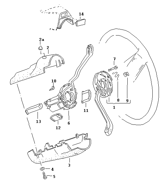 Jetzt werden die Stecker von Blinker- und Scheibenwischerschalter abgezogen (oberes Bild Nummer 11, 12, und 13) ggf. auch noch die Verbindungen für die MFA oder Geschwindigkeits-Regelanlage. Die Lenkstockschalter sind mit drei Schrauben (oberes Bild Nummer 7) befestigt. Hat man sie heraus gedreht, kann das komplette Teil von der Lenksäule heruntergenommen werden. Jetzt wird’s interessant : Hat man keine Geschwindigkeits-Regelanlage oder MFA, bzw. gibt’s keine Probleme mit dem Kabelbaum. Ebenso sind Cabrios ab Baujahr 88 unproblematisch, da sie den Golf 2 Kabelbaum haben. Also, einfach alle Stecker mit den Golf 2 Teilen verbinden und die Lenksäulenverkleidung + Lenkrad wieder einbauen. Fertig. Hat man allerdings eine Geschwindigkeits-Regelanlage oder MFA (z.B. ein 83'er Pirelli GTI), muss man diese Steckverbindung ändern. Es bleibt jedem selbst überlassen ob der Stecker am Kabelbaum oder am Lenkstockschalter getauscht wird, einer von Beiden muss angepasst werden. Unsauber könnte man auch Quetschverbinder oder Lüsterklemmen nehmen - Ich rate aber davon ab ! |